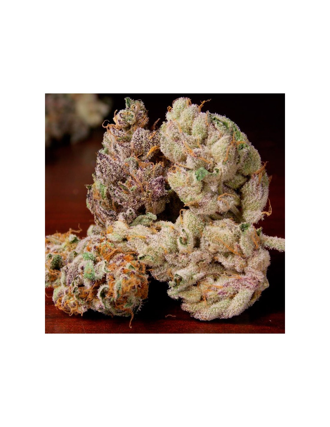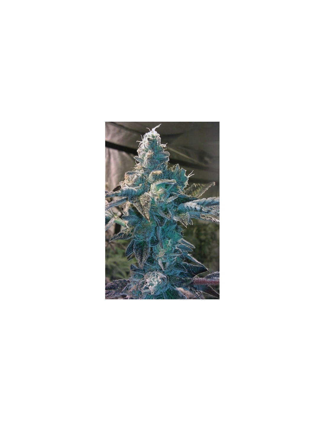 La plante reste de taille moyenne et affiche des teintes colorées avec des têtes denses recouvertes de résine collante. Elle est visuellement tentante avant même de s’en approcher.